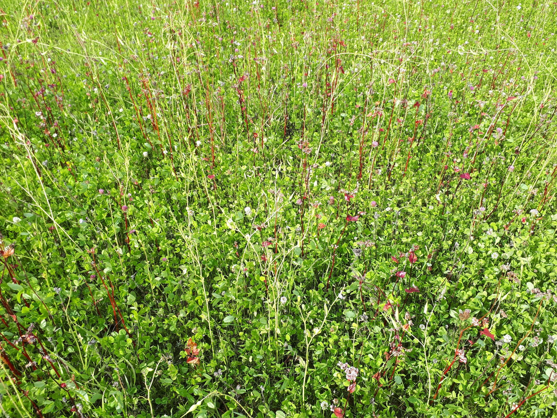 Röd- och vitklöver hade växt till sej bra under sommaren och börjat blomma på hösten.