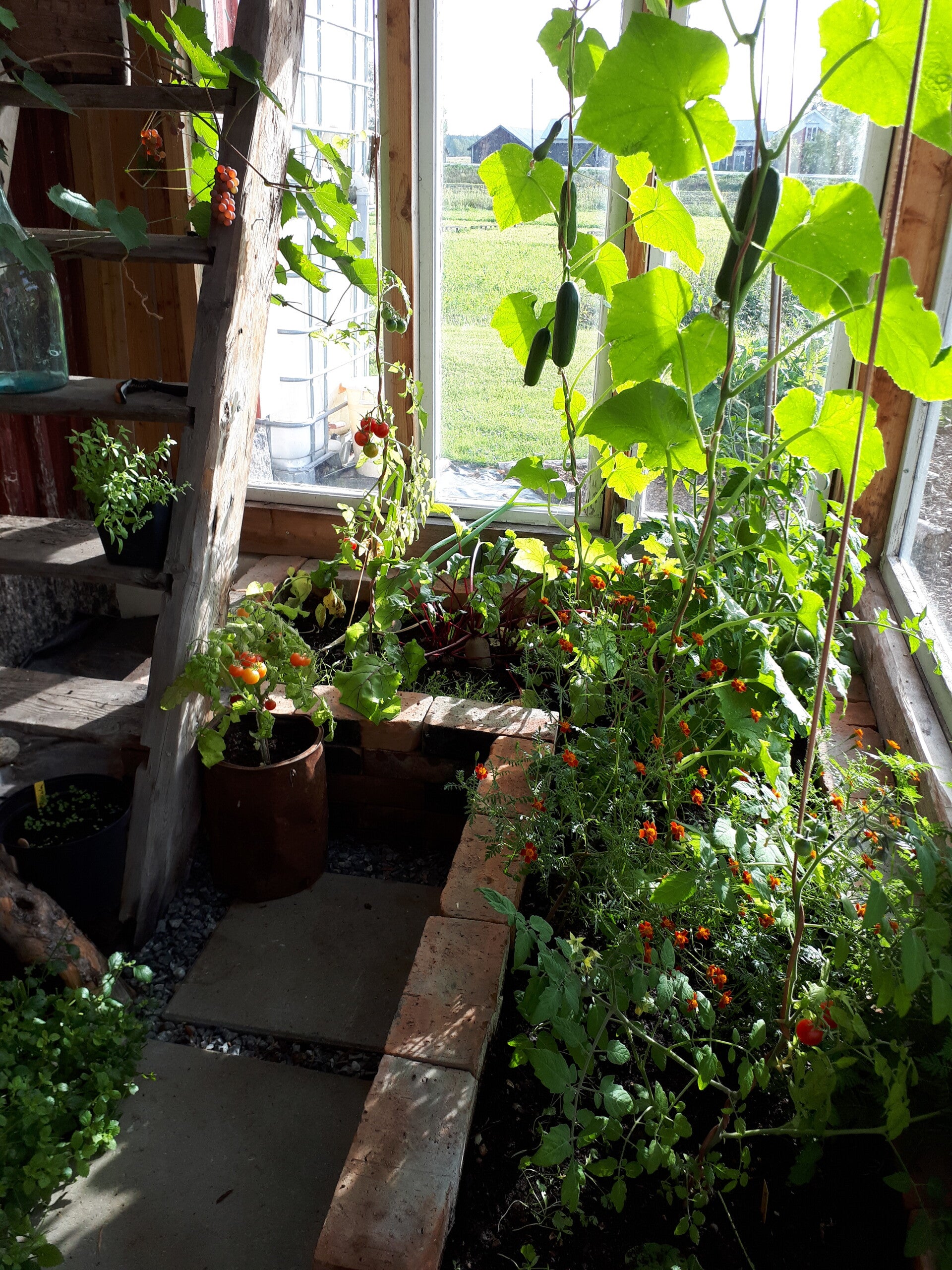 Förutom någon enstaka gurka och tomat så äter vi altså inget mer än diverse kryddor från växthuset under denna årstid. Basilika och meiram är sådana kryddor som trivs i värmen och kan bra odlas i kruka! Oregano, timjan och citronmeliss i jordbotten hade jag ju också som mångåriga växter!